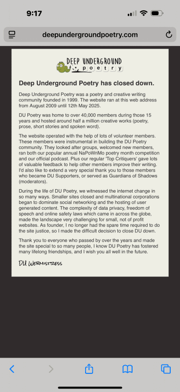 I went to do a final lap and it was all gone.. it hurts but in the most beautifully tragic way. I’ve done a lot of growing as a writer on DUP. Made lots of connections and friendships there.