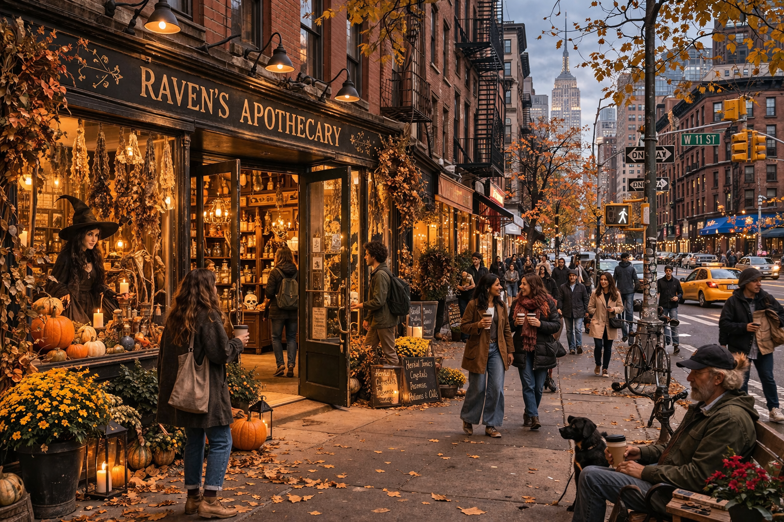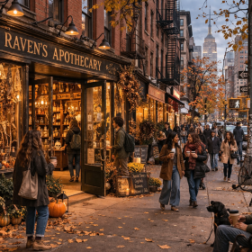 Laughter and curiosity spill out onto the sidewalks, people mingling in the crisp air as footsteps brush past, the city comes alive in that quiet October way.