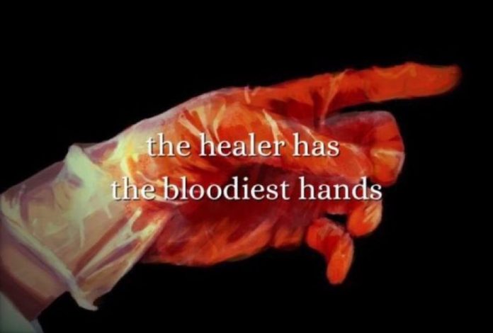 Face mask, vinyl gloves and plastic apron. A bloody surgeon.