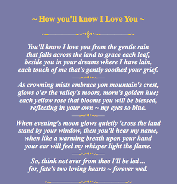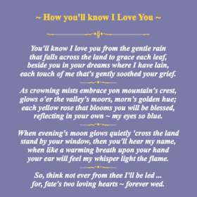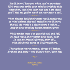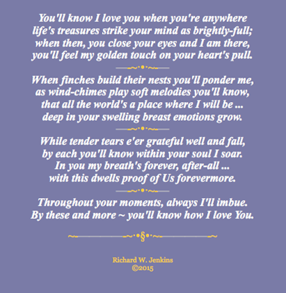 INTRO: In as much that I knew this piece would be about love, the decision of a Sonnet was born. And, when the first Sonnet was finished, I realized that saying how “just anyone” would know they’re loved would not suffice, because I had not said all I felt about how one would know they are loved, and I thought, “This seems impersonal.” So, I decided by placing myself as the one telling them, that it would take on a more emotional and personal feel … and, so it went from first to final word.