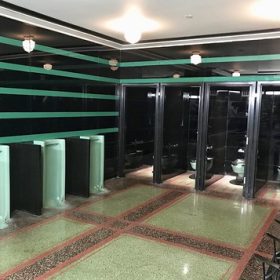 Stepping into the men’s room, I was overcome with the neon sparkle. The place was immaculate and brilliant, not to mention quite large, even for a hotel facility. The toilet stalls were most generous in size with heavy wooden doors that traveled from floor to ceiling. Tile colors were a bold match to the black and green walls.