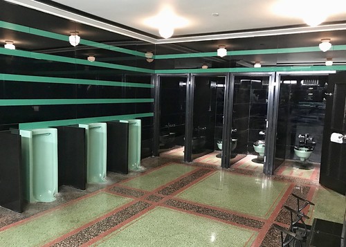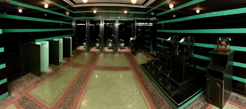 “The men’s restroom here is a tourist attraction and has been filmed in several movies due to its eclectic art deco. I wonder if you’d like to see it?”