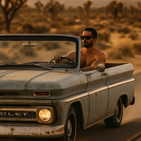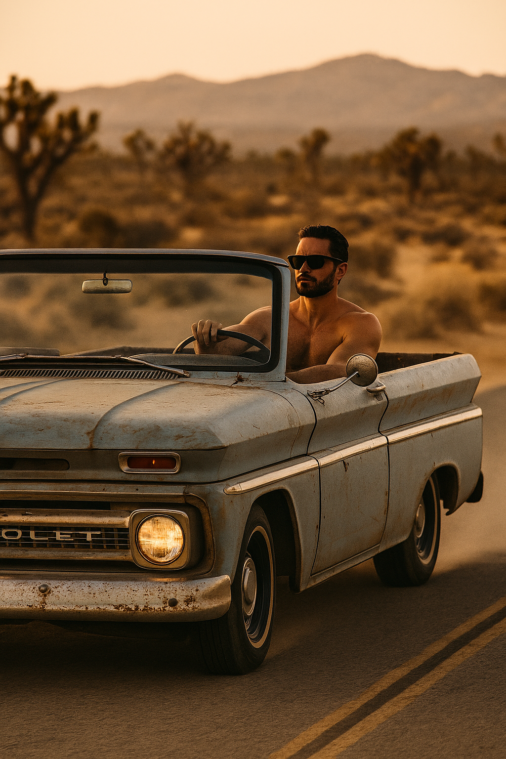 Left in the dust of the bus I intentionally missed at this whistle stop somewhere in New Mexico, I started to walk. It was like a sauna outside, so when I heard a vehicle approach from behind, I put out my thumb in hopes of getting to some society with air conditioning. As my thumb extended, I turned my head to lay eyes on an old Chevy that was topless. The driver, shirtless, showed himself and his tanned muscles to the world and to me. At that moment, I didn’t know if the humidity in my dampening panties was stimulated by the beautiful old Chevy or the hunk with sunglasses behind the wheel, or the heat of the desert itself. Whatever it was, I kept my thumb up enthusiastically as I extended a leg and made eye contact with a big smile. He pulled right up to me and asked, “Where ya headed?”