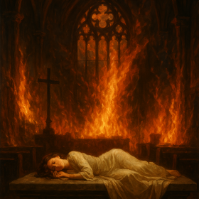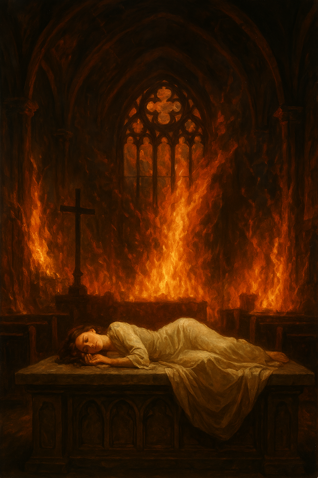 But the woman! Never had I witnessed anything as such! I crossed the threshold into the chapel and at the instant I was clear of the door, it slammed shut! Startled, I rushed to the door, grasping the handle, and struggled with it. But the door would not move! Then there was a paradoxical sense of both warmth and dread coexisting within that chapel of flame and blood-redness. Had I been alive, I would have gasped before making my way down the aisle towards the altar. And as I approached the young woman, I noticed that she was not in funeral attire like the others. Was she alive, I thought. “Hey!” I raised my voice as if I could awaken her.