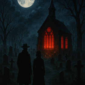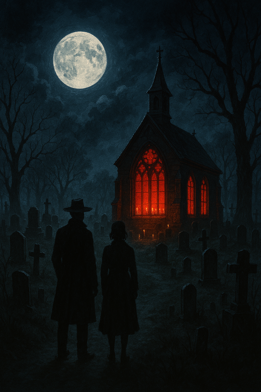 I debated running after Jason and catching up to him, but what I now noticed of that reddish glow within the veil of fog, which had now thinned considerably, what emerged was a small chapel, with tall, arched stained-glass windows that were blood-red illuminated by candlelight within. It looked so inviting as it was the only brilliant color I’ve seen since before the crash.