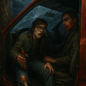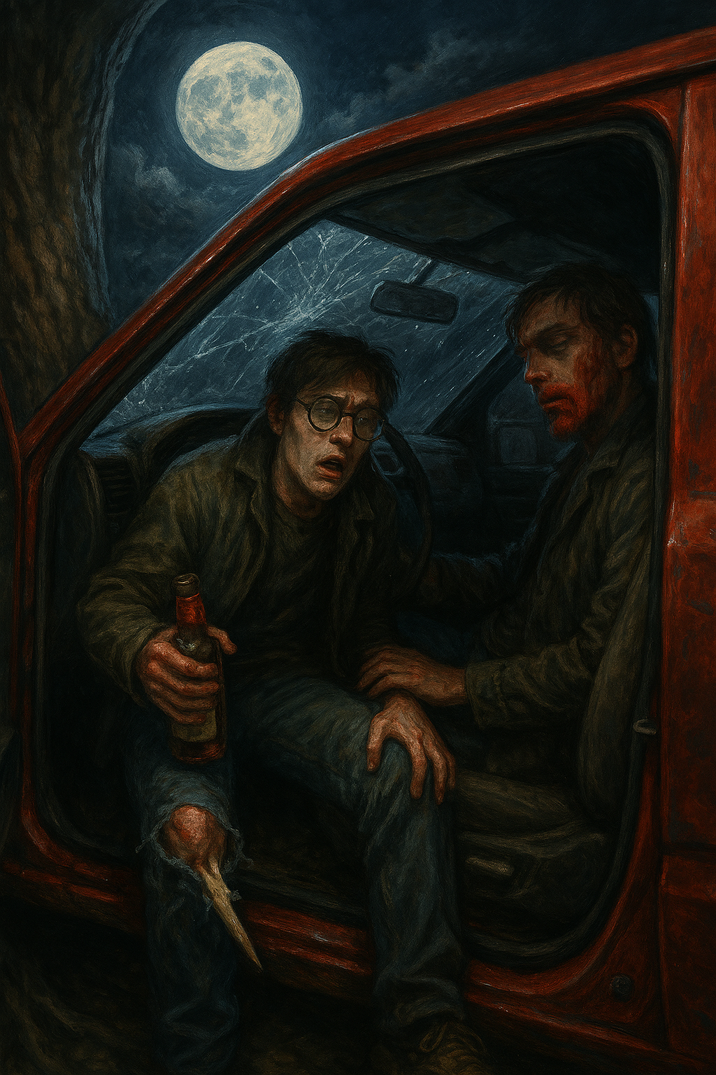 Answering, I cheered the bottle and slurred drunkenly, “We’re ghosts already in this two-door coffin with four burning wheels!”