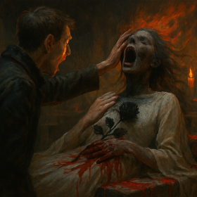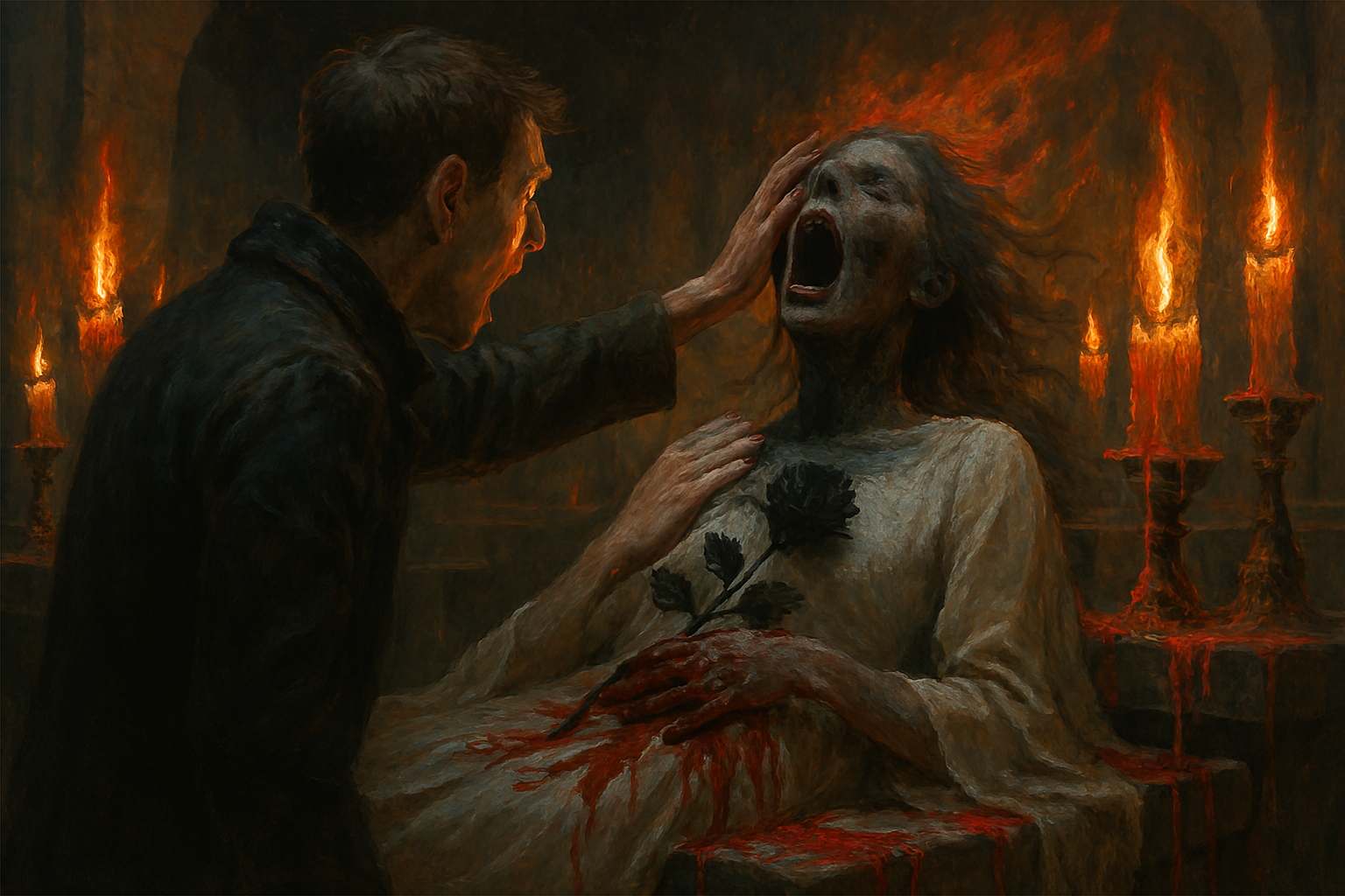 I stepped closer to her until I was nearly right beside the altar where she lay. Then I noticed the large thorns on the stem of the black rose had pierced her skin in a couple of spots, and from which streams of blood traced down her delicate hands. The dead don’t bleed, I thought. Then in a moment of excitement, I delicately rested my hand on her forehead. What happened next filled my very soul with horror. The point of contact between the palm of my hand and her forehead, her skin rapidly decomposed, turning gray and blackish, and as it did so, her head arched back and her jaw opened wide, and out came a terrible, piercing scream of agony. I shuddered and shot back several steps. And as the screaming intensified, every candle flame in the chapel flared up like blowtorches, and their crimson wax candlesticks melted rapidly until there appeared pools of blood dripping over the edges of the tables, dripping and dotting the stone floor.